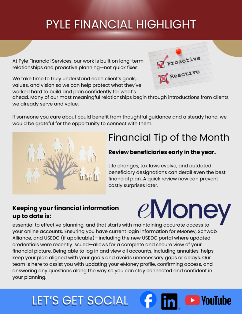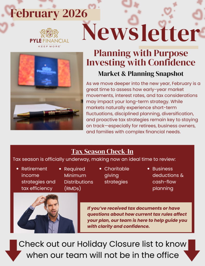Our February Newsletter focuses on proactive financial planning, early-year tax considerations, and strategies designed to help clients stay confident and informed in an evolving financial landscape. Inside, you’ll find practical guidance, timely reminders, and a snapshot of how Pyle Financial Services continues to support long-term planning goals.