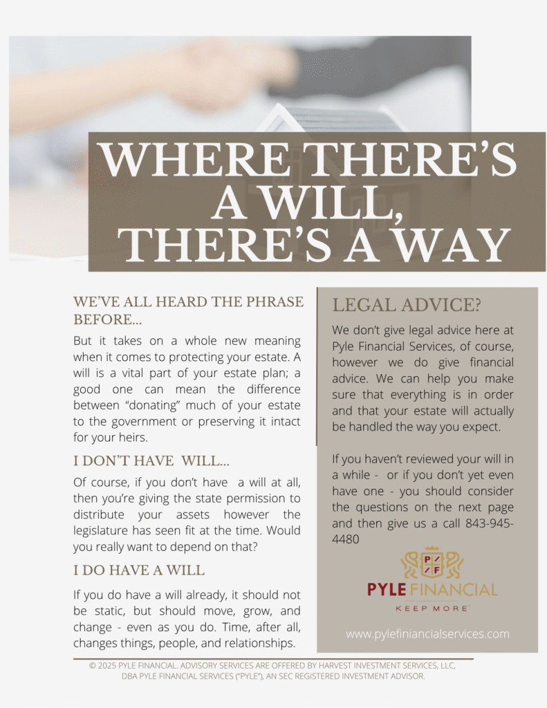 We don’t give legal advice here at Pyle Financial Services, of course, however we do give financial advice. We can help you make sure that everything is in order and that your estate will actually be handled the way you expect. If you haven’t reviewed your will in a while – or if you don’t yet even have one – you should download your FREE copy of our checklist at the bottom!